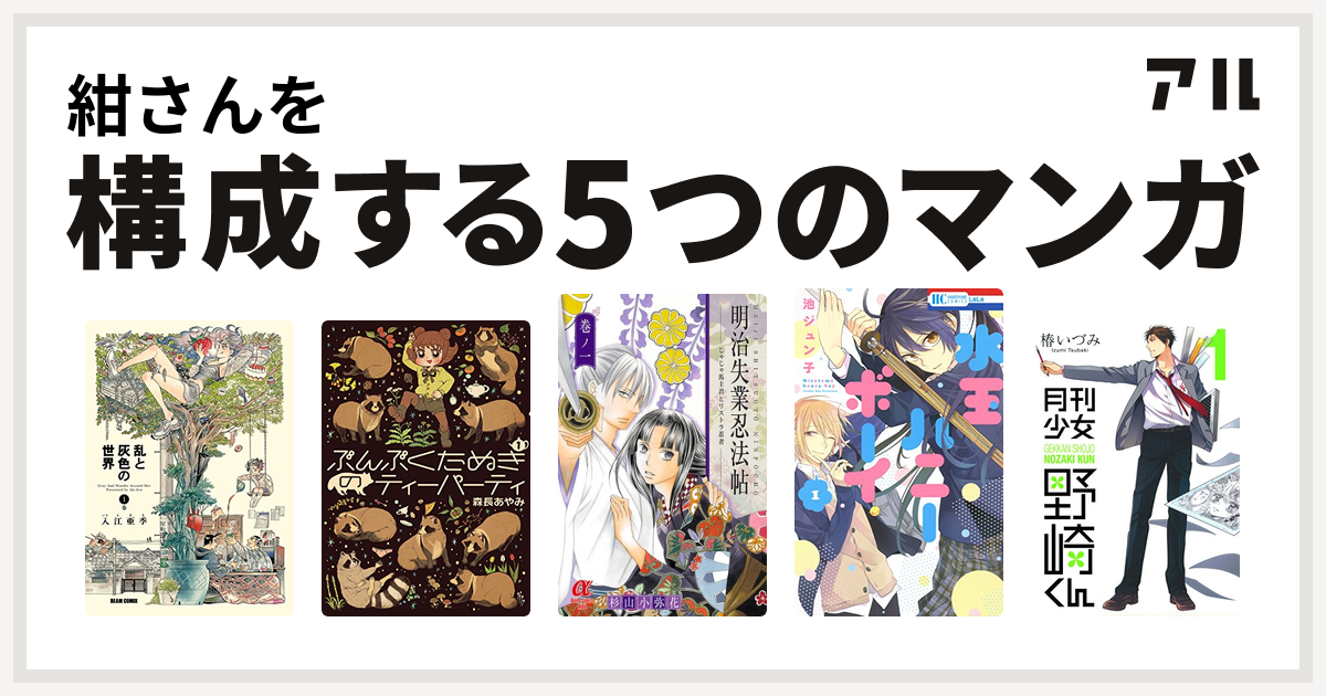紺さんを構成するマンガは乱と灰色の世界 ぶんぶくたぬきのティーパーティ 明治失業忍法帖 じゃじゃ馬主君とリストラ忍者 水玉ハニーボーイ 月刊少女野崎くん 私を構成する5つのマンガ アル